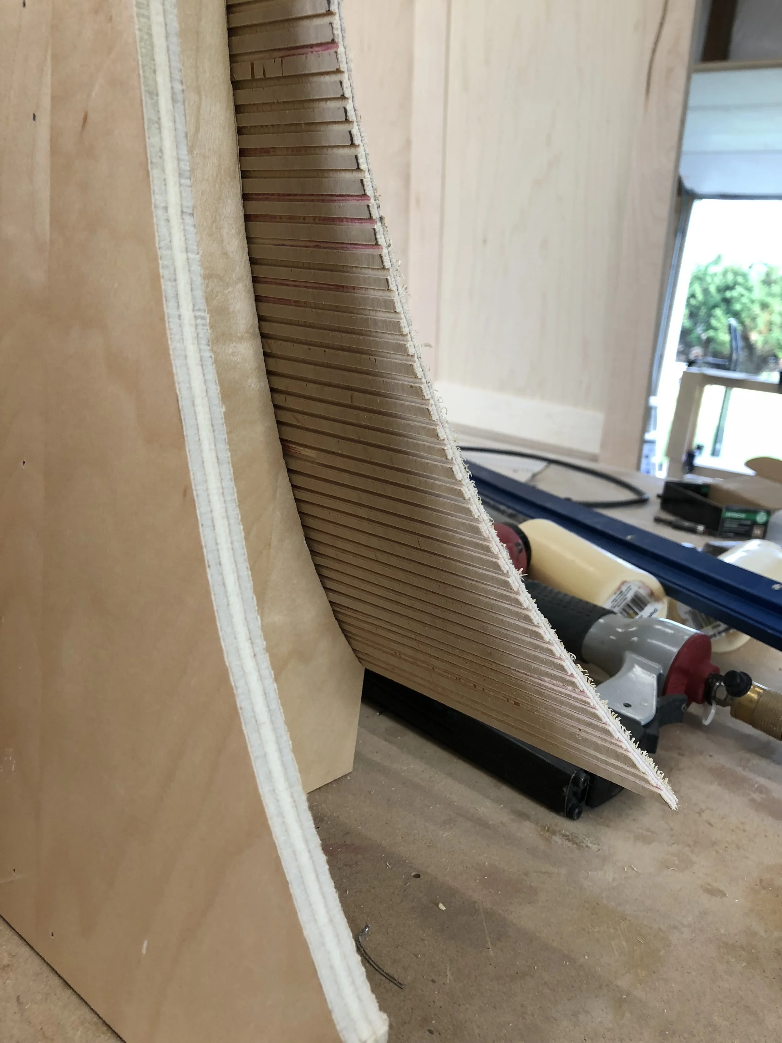 First we needed to design the hood around the specifications for our ventilator and decide on the pattern shape of the curve. We tried a few different shapes before finally settling on one. After making the pattern we used it to cutout all the parts for the frame of the hood. After assembling the frame, we were ready for what we call the 'backing.' This is just inexpensive 3/16" birch plywood with a bunch of saw kerfs ripped in the back so it can be bent to fit the shape of the curve without breaking. (Right) We cut pieces of this a little large so we could tack it in place on the sides of the hood and then use a scribe to trace the curve of the front of the frame onto the back of the backing.