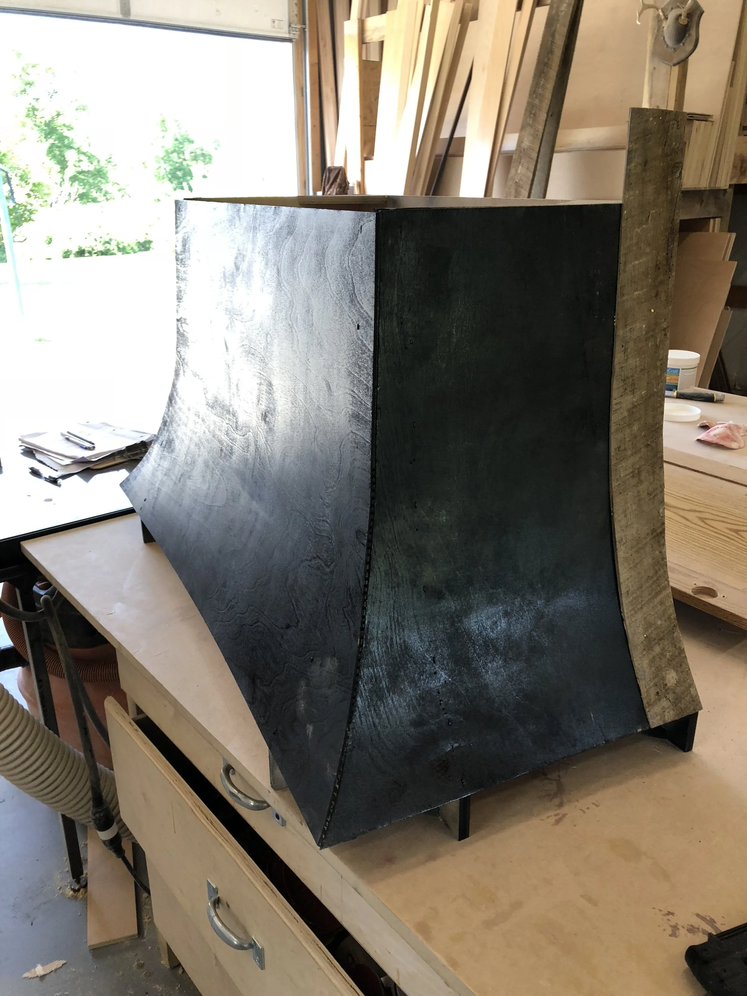 After we had the entire frame built, we spray painted it black so that any holes in the reclaimed wood wouldn't become eyesores. Then we began laminating the strips of reclaimed wood we had machined onto the frame one at a time. (Left) When we got to the curves, we would simply trace the curve, cut it on the band saw, then laminate it in place. This was a tedious but rewarding process. After all the strips we laminated, we added the crown molding and the decorative skirt to hide the actual ventilator, and...