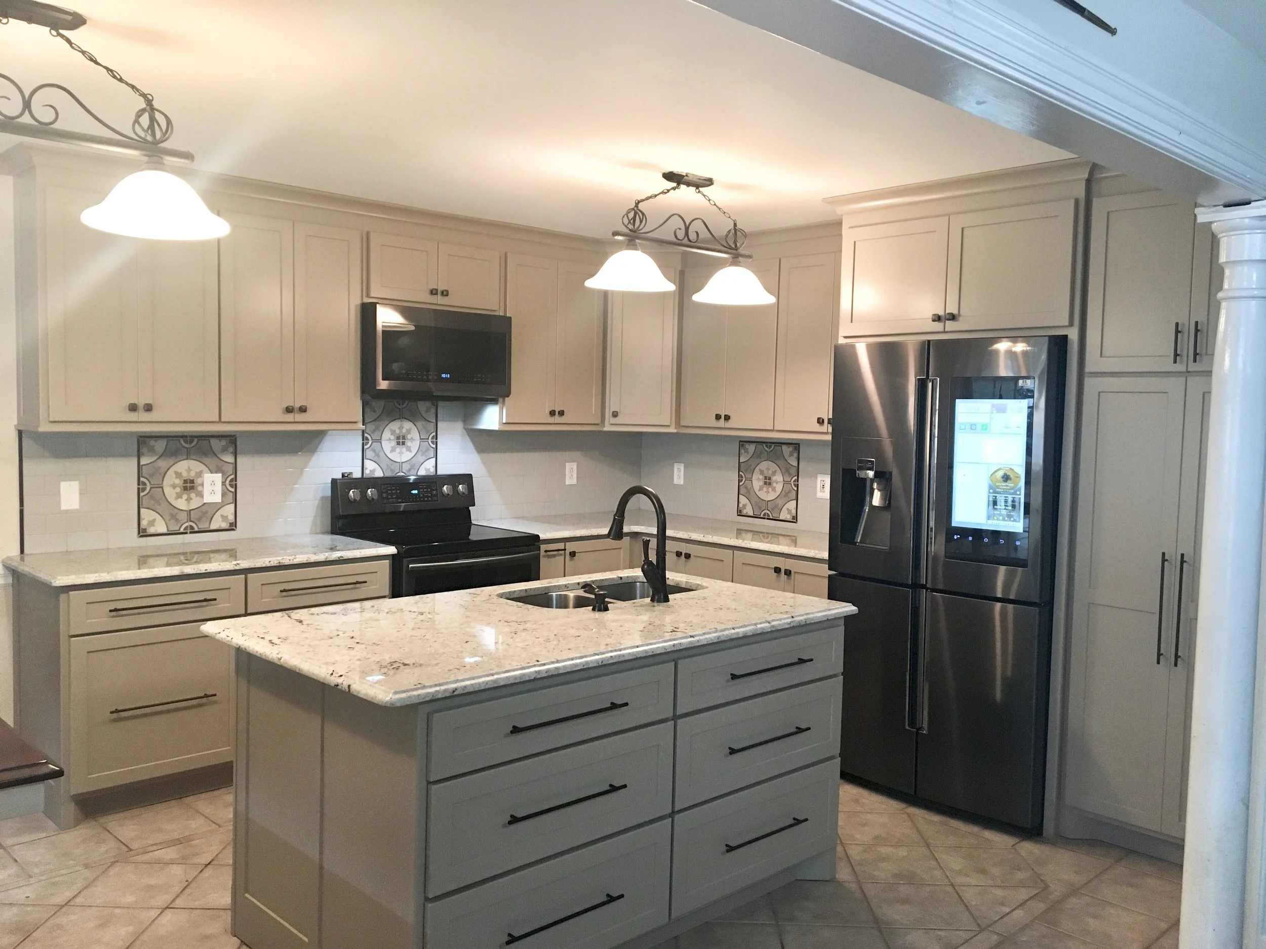 Our client's old kitchen didn't have a pantry closet for storage so most of her upper cabinets were filled with her groceries leaving little room for glassware and dishes. So in her new design, we incorporated a floor to ceiling cabinet and installed four pullout drawers.